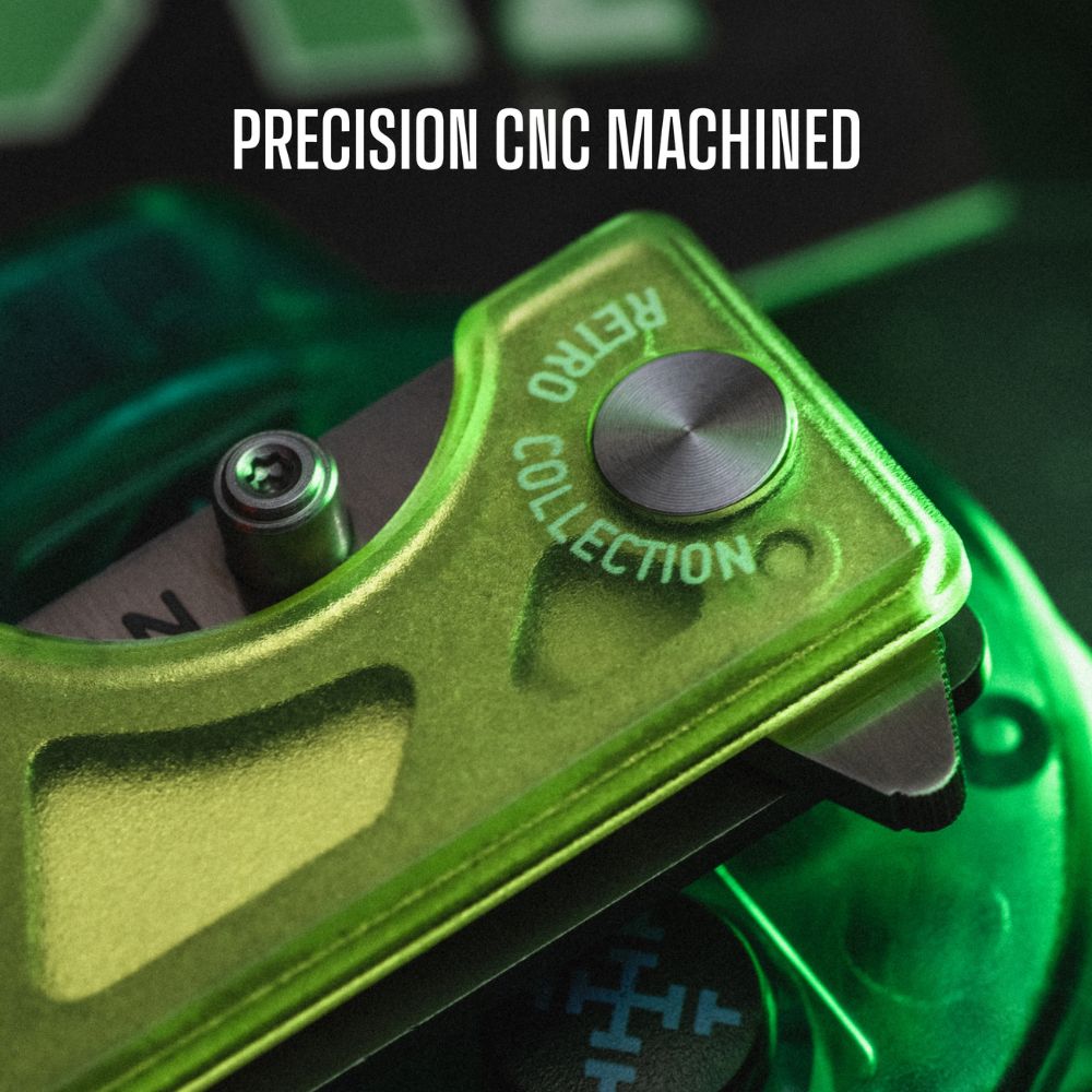 For the front handle, our Arcadite polymer delivers a vivid, translucent finish - designed to hold clarity and resist wear. Near the pivot screw is a subtly printed ‘Retro Collection’ design, with sizing markings near the other screws to layer in function with design. Beneath it, a steel plate with a cut plate adds in some extra levels.