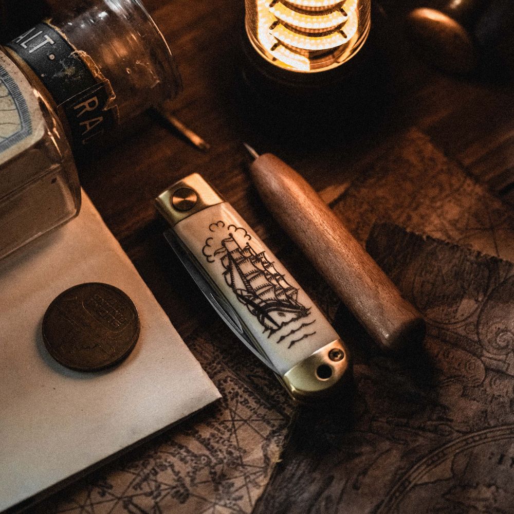 Every Scrimshaw Henry comes with a complete engraving kit and step-by-step instructions right inside the box. Each knife includes at least one blank bone panel designed specifically for you to carve. Whether you’re etching your initials or creating full artwork, the process is approachable and rooted in the same techniques sailors used over a century ago.