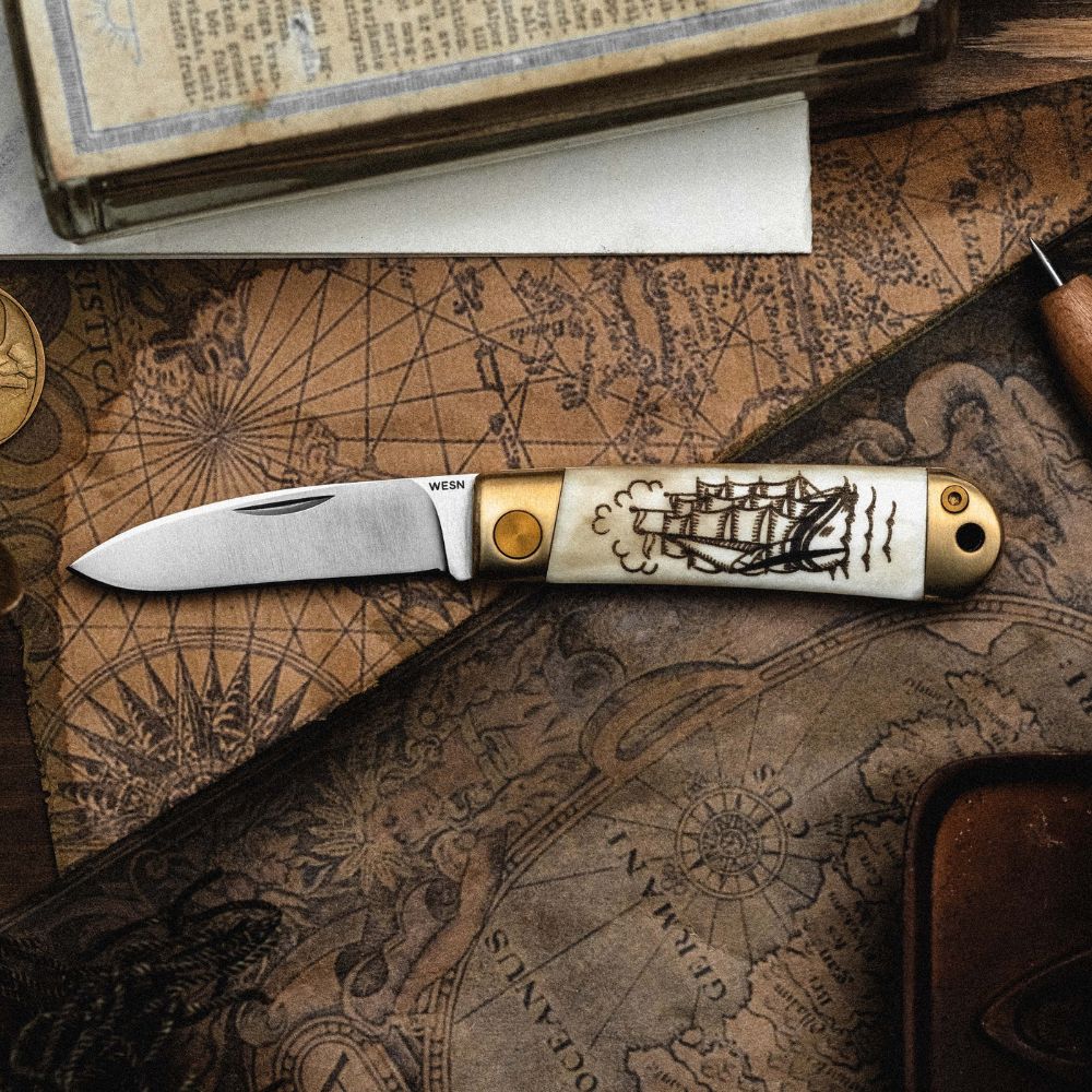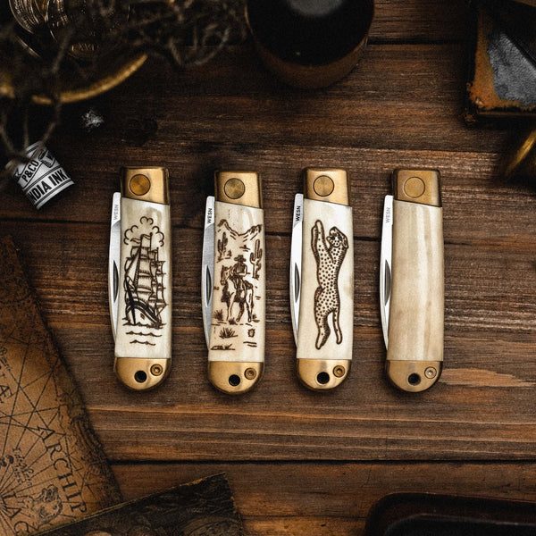 Scrimshaw is a classic maritime artform that dates back to the 18th and 19th centuries, created primarily by sailors on long sea voyages. With limited materials, they carved intricate designs into whale bone, ivory, and other natural resources they had on hand, filling those carvings with ink or soot. The result was a knife that wasn't just a tool - it was a personal artifact, carrying the maker’s story. Our Scrimshaw Henry collection is a modern interpretation of this tradition.