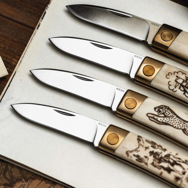Every knife arrives in a carefully curated P&Co. x WESN box. Inside you’ll find a bottle of India ink, a wooden carving tool, and step-by-step instructions to guide you through creating your own scrimshaw artwork. Everything you need to make the knife truly yours.