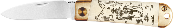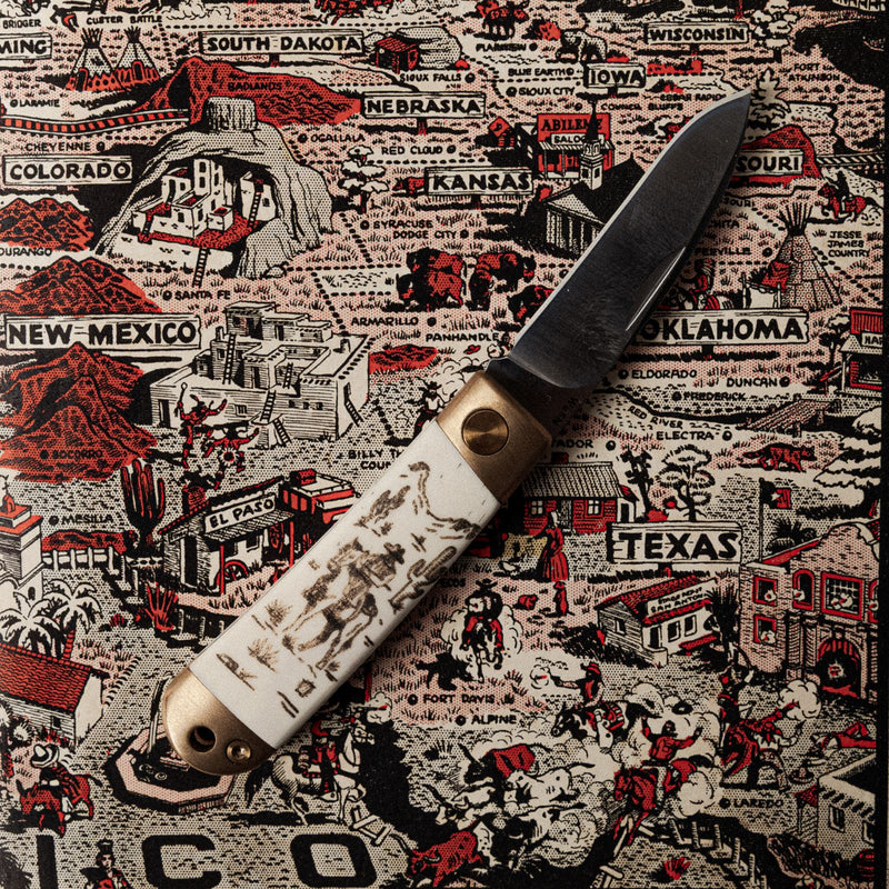 The Scrimshaw Henry collection is our modern take on classic scrimshaw style knives — made in collaboration with Birmingham-based P&Co. This version of our classic slipjoint knife, the Henry, includes brass hardware and an ethically sourced ox bone handle, perfect for custom engraving.