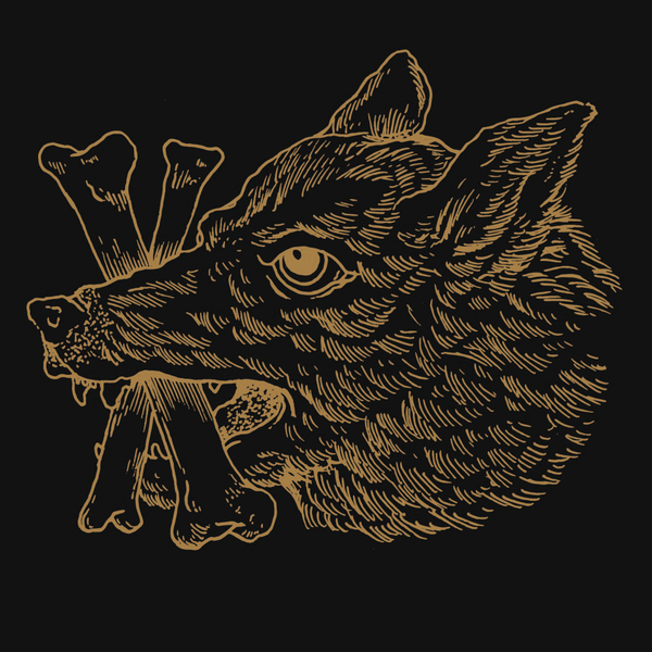 The front features a wolf emblem framed by the motto “Sticks and stones and steel and bone.” The back holds a full canvas illustration of a horse mid-battle with a wolf and the text “Power through it” - complete with Mr. Skelly wielding the WESN Microblade.