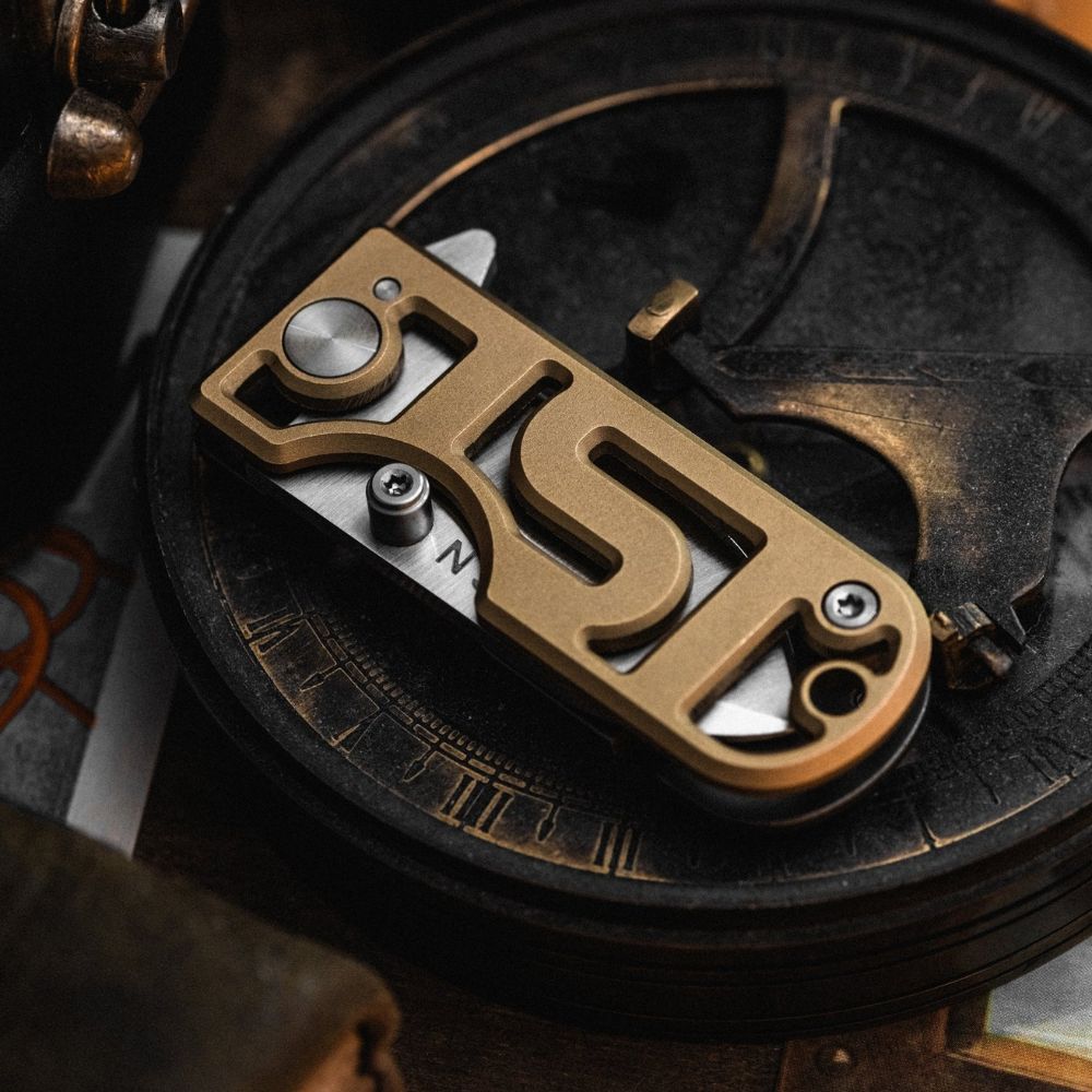 Front Handle Scale: Raw brass with see through structure that reveals the anatomy of the blade underneath when closed, and back handle when open. See through design matches the puzzle box and features the 1ST Magic logo.