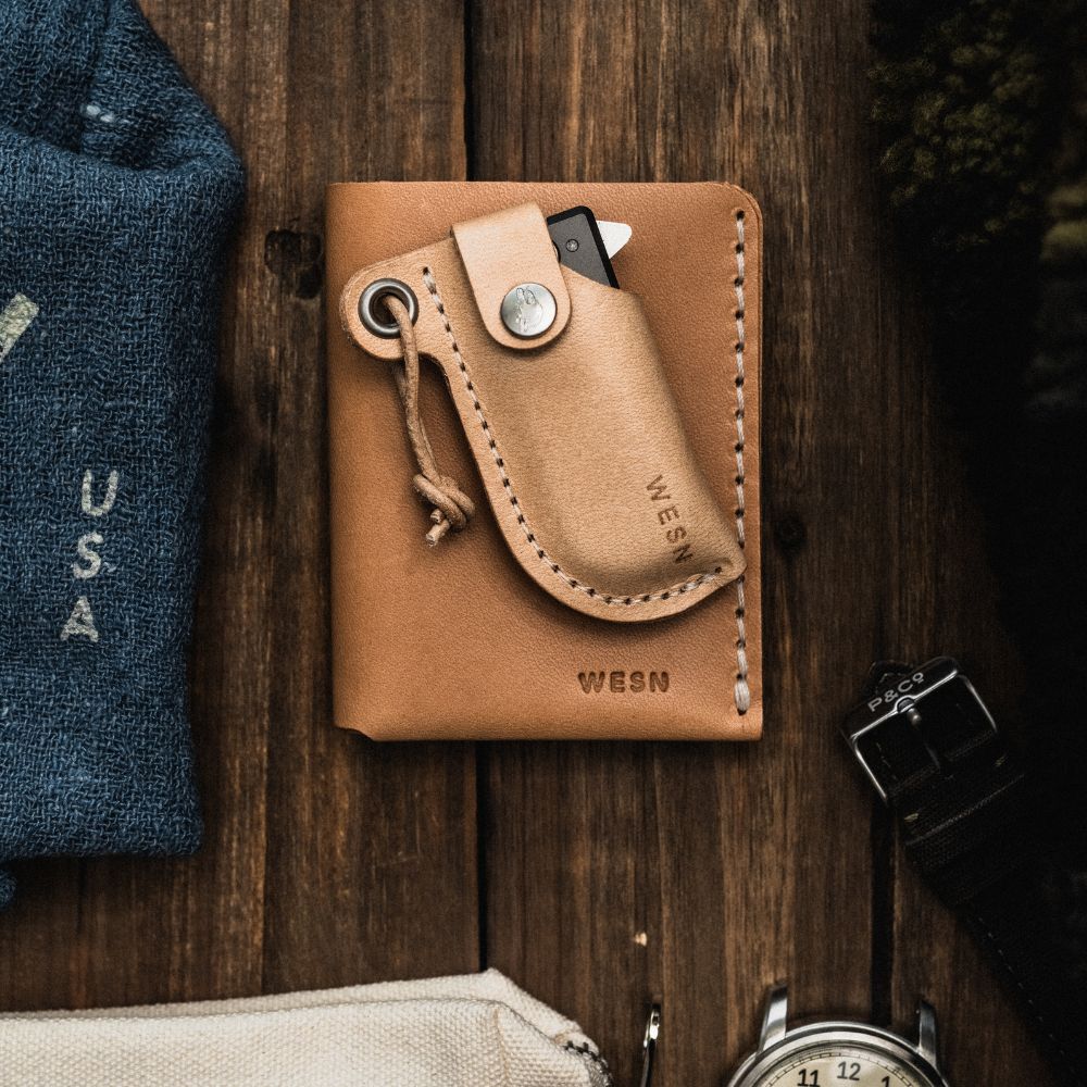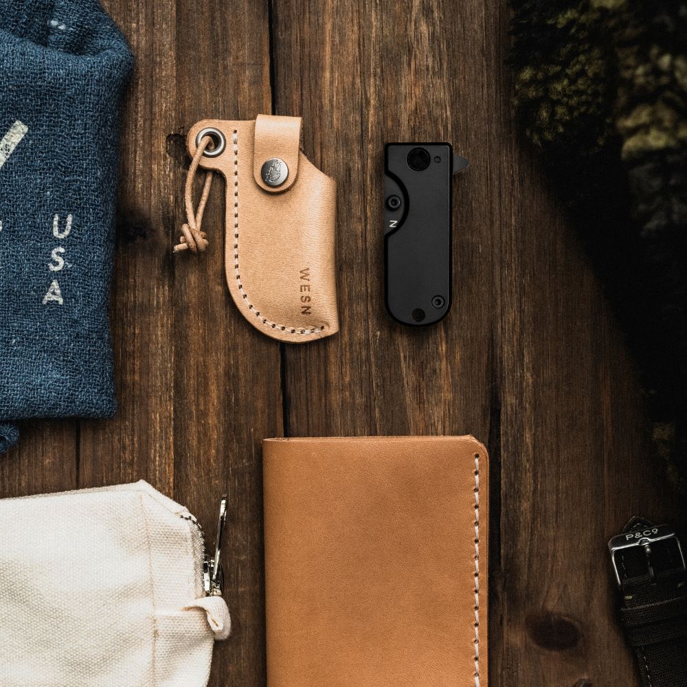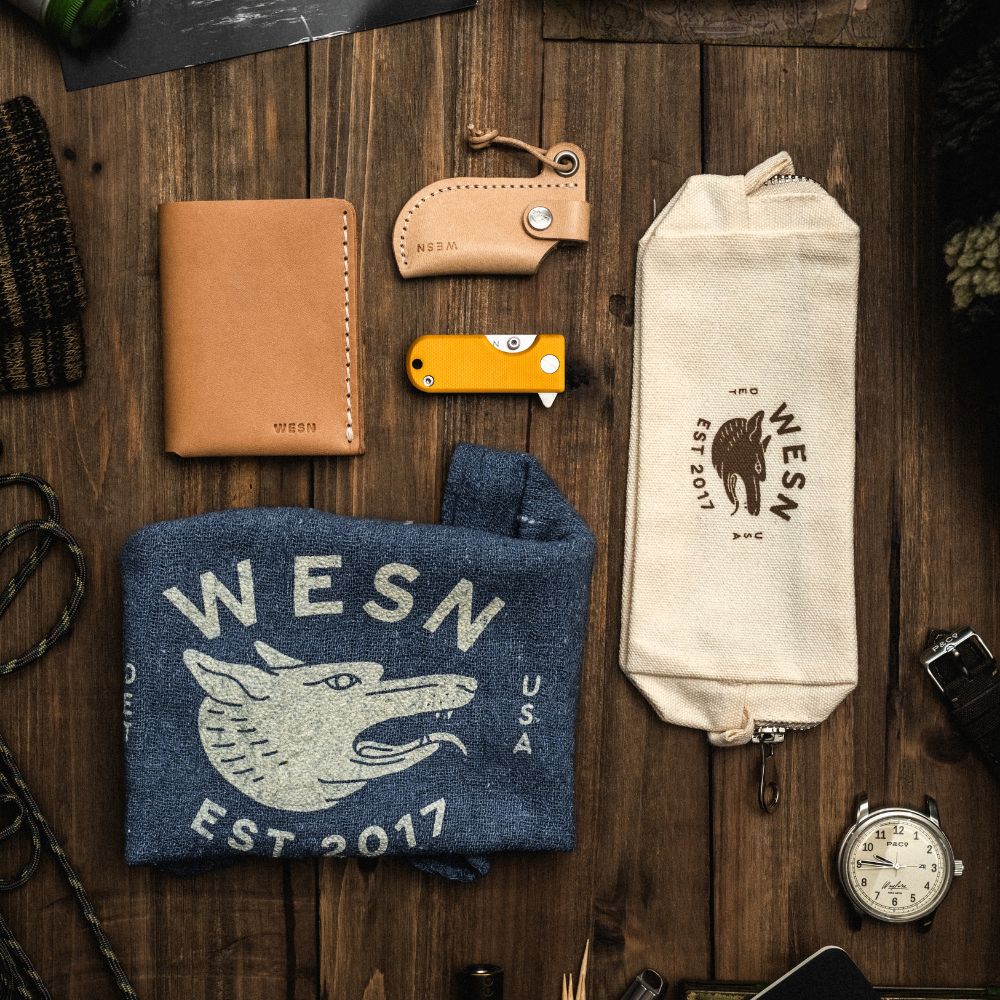 Inside the Gifting Bundle you’ll find five everyday essentials: a Microblade of your choosing, a Swedish-made leather sheath, the Forsta minimalist wallet, the Wolfpack Work Rag, and a WESN storage pouch to keep everything together. Each piece earns its place — nothing added without purpose.