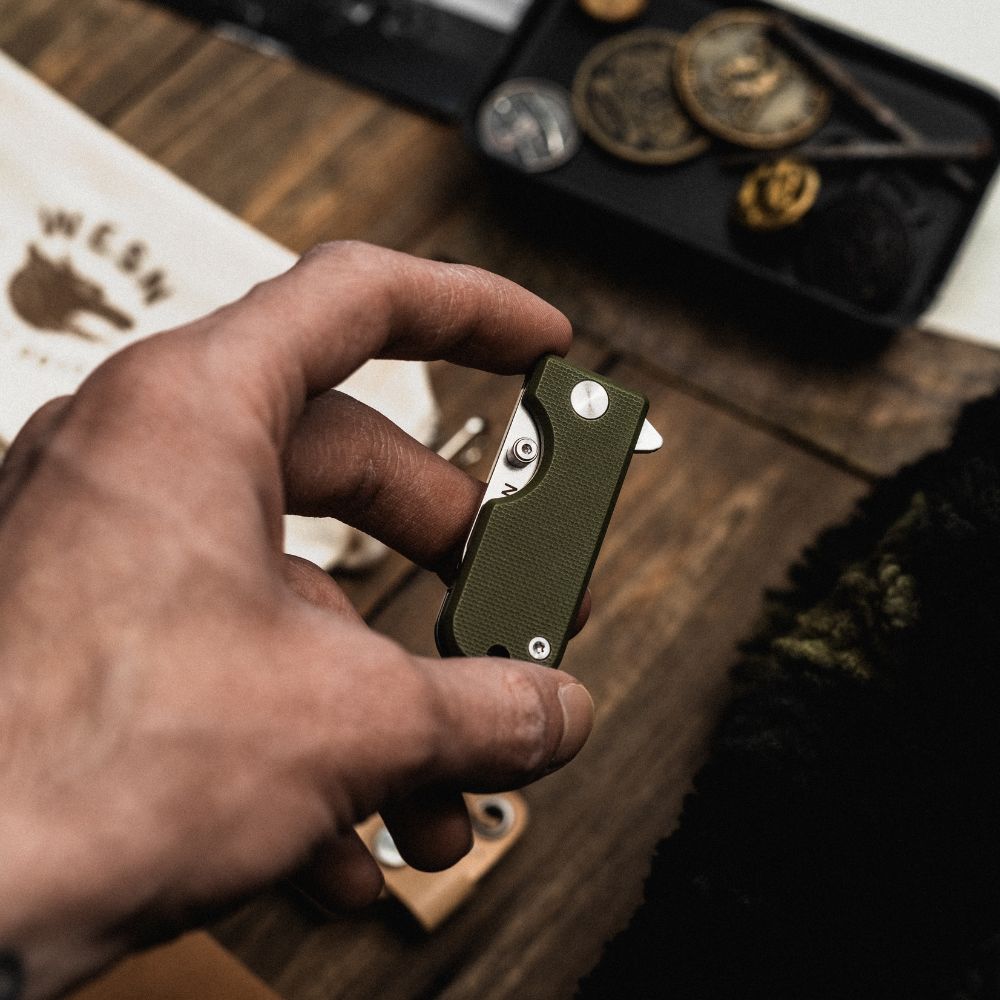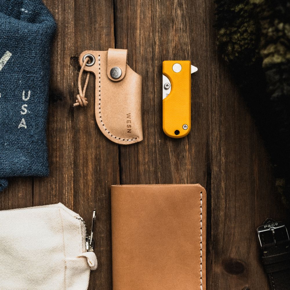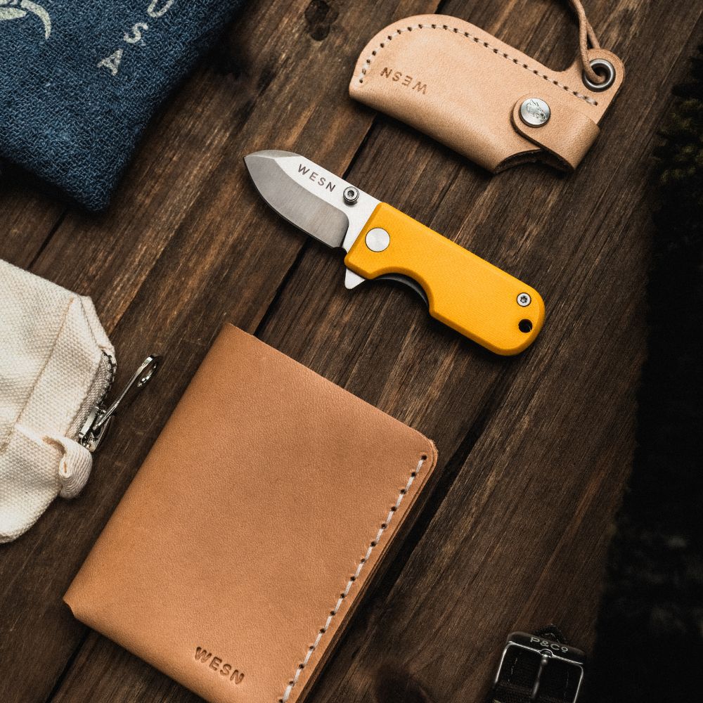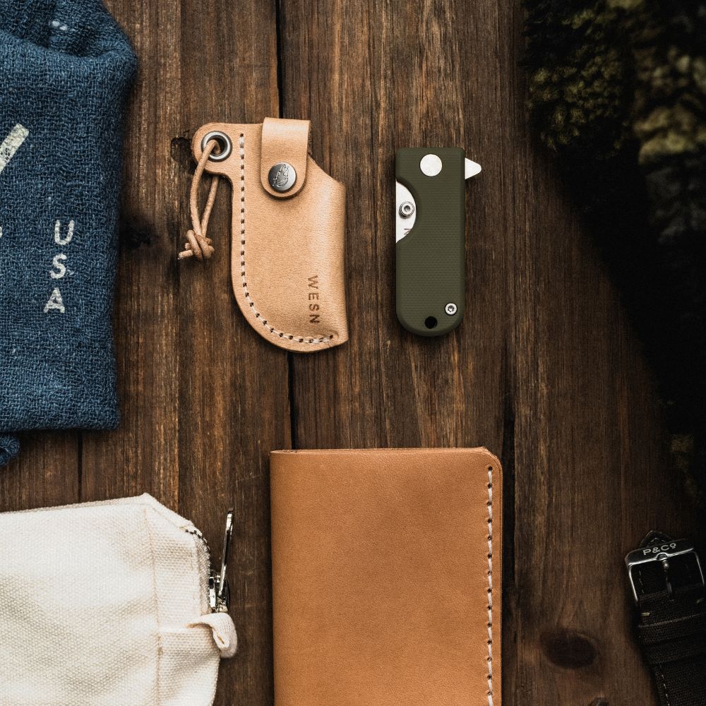 Inside the Gifting Bundle you’ll find five everyday essentials: a Microblade of your choosing, a Swedish-made leather sheath, the Forsta minimalist wallet, the Wolfpack Work Rag, and a WESN storage pouch to keep everything together. Each piece earns its place — nothing added without purpose.