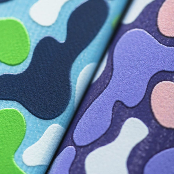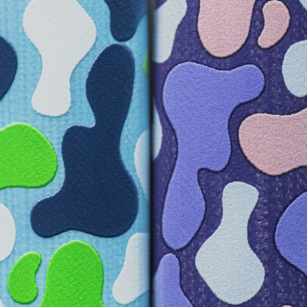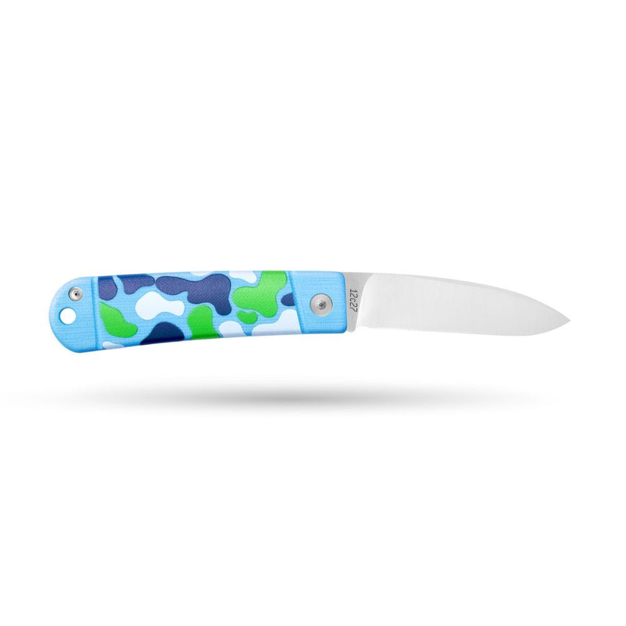 A bright sky blue G10 base layered with vibrant green, navy, lavender, and white camo forms.