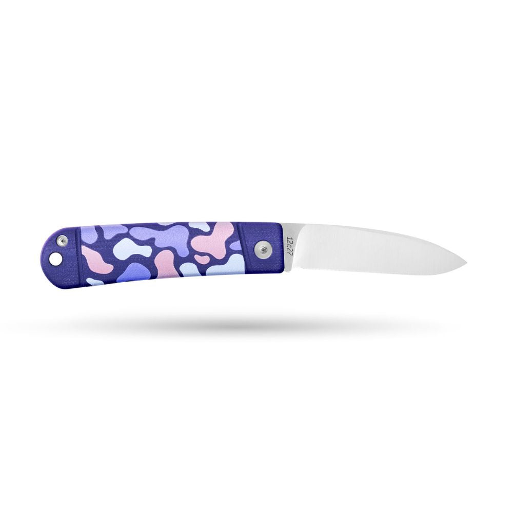 A deep violet G10 base accented with lavender, soft pink, white, and navy camo shapes.