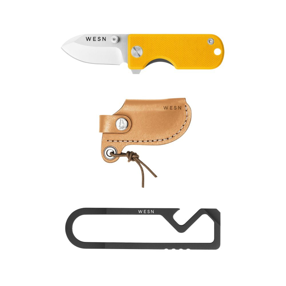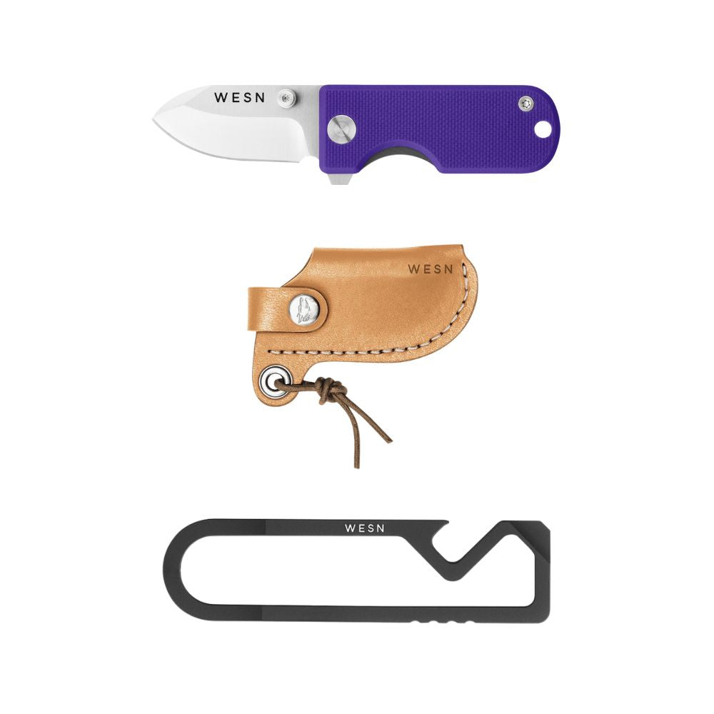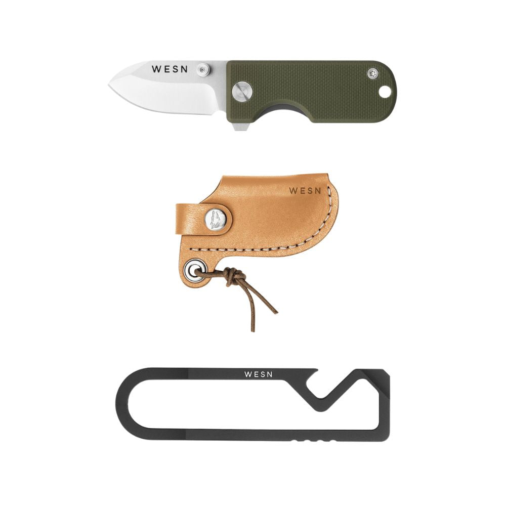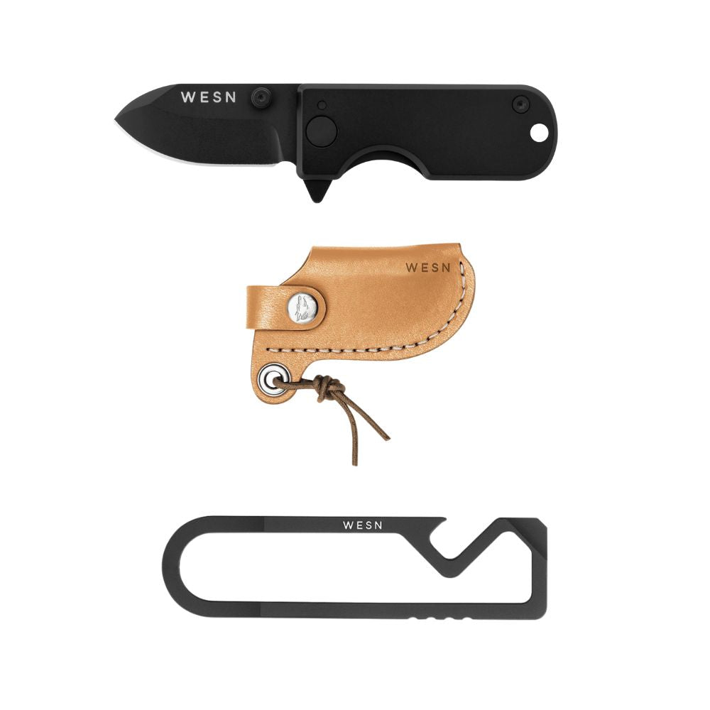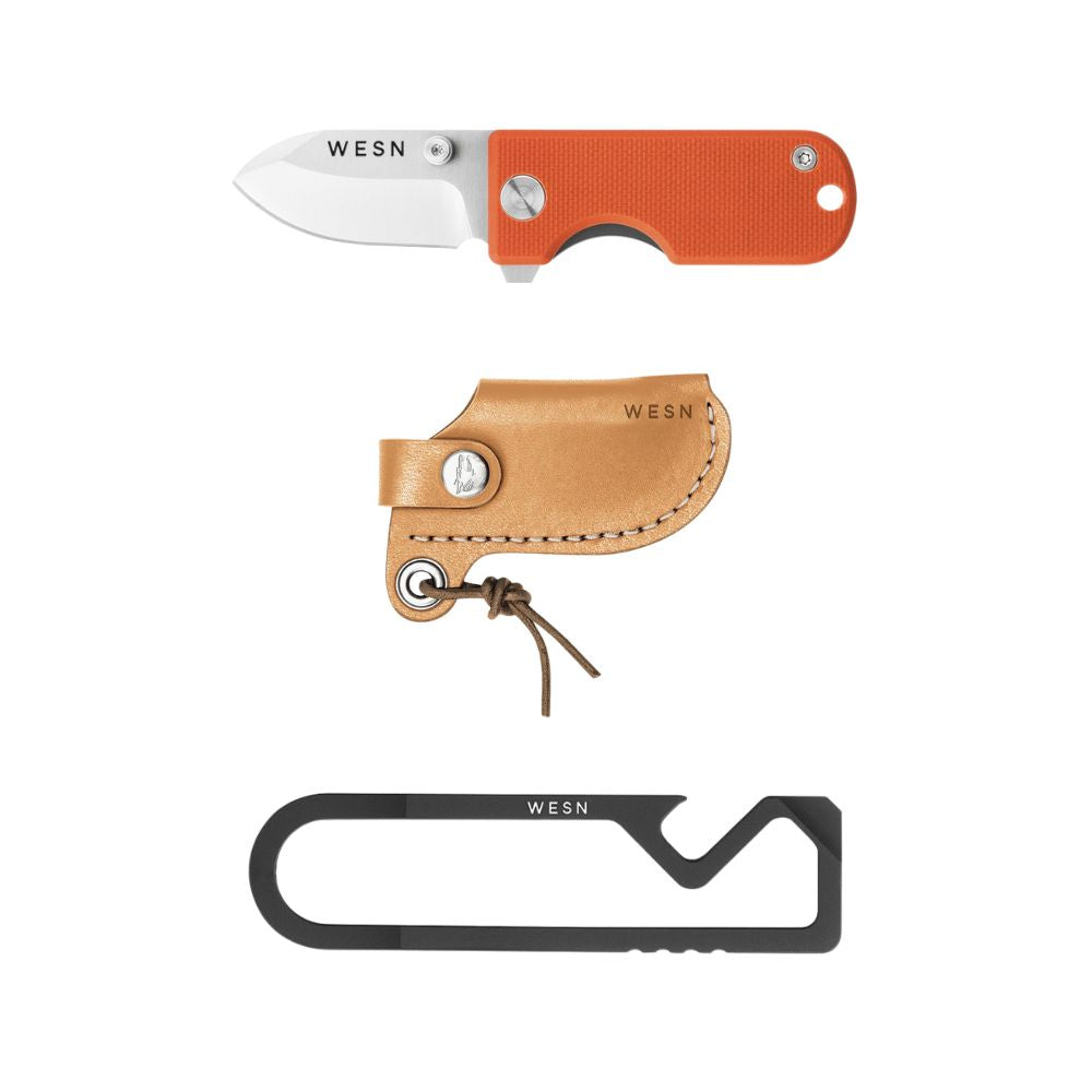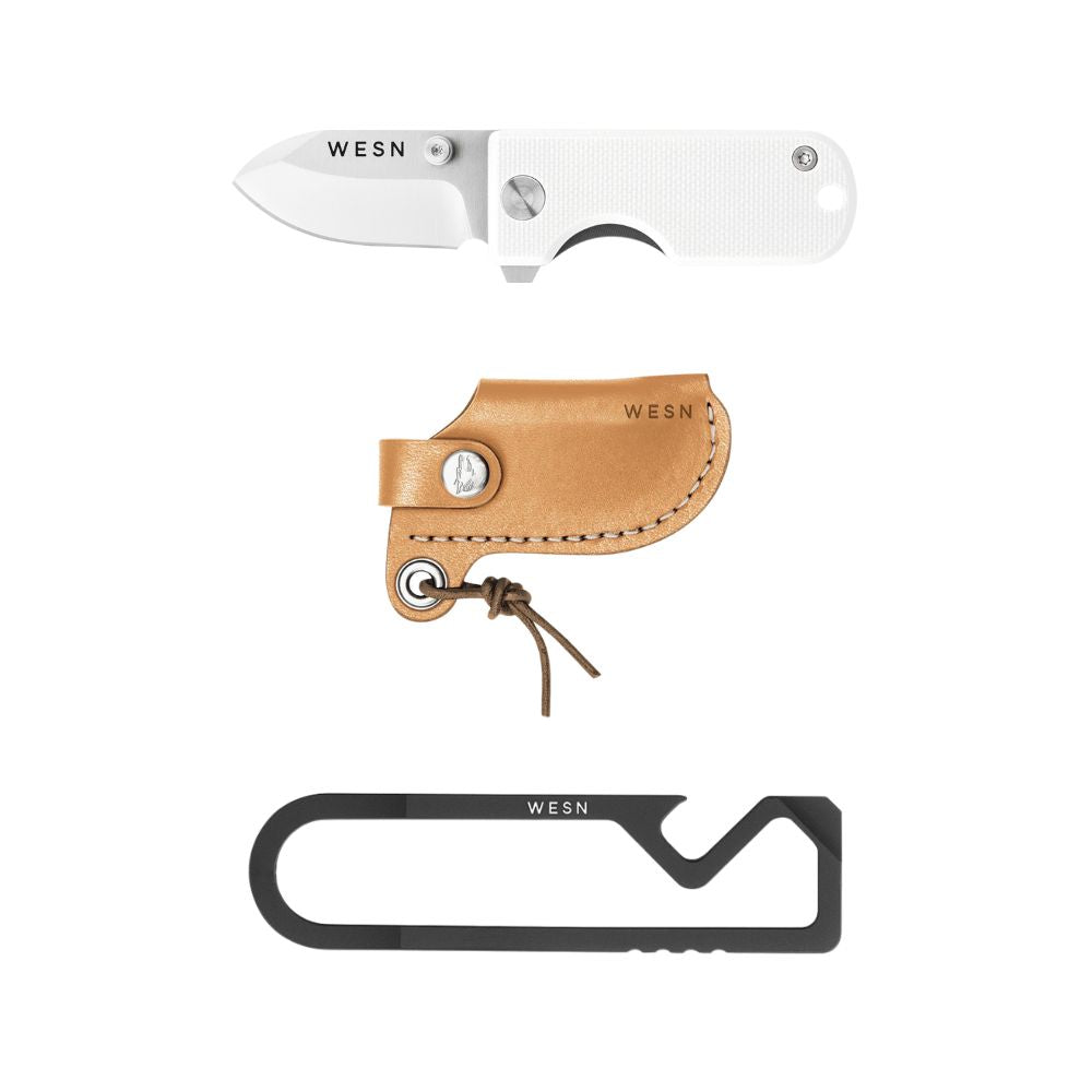 The Starter Kit Bundle is a simple, no-frills way to get more gear for less — and the ideal introduction to WESN. Inside you’ll find three of our best sellers: a Microblade of your choosing, a natural leather sheath, and our MT keychain multi-tool. Built to be used every day. Backed for life.