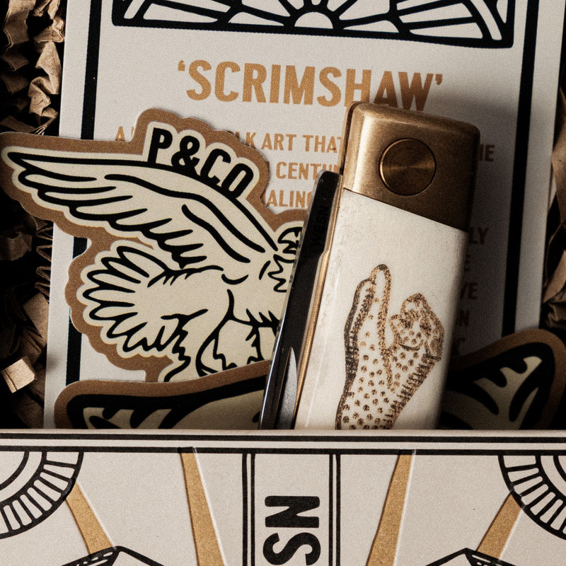 Every knife arrives in a carefully curated P&Co. x WESN box. Inside you’ll find a bottle of India ink, a wooden carving tool, and step-by-step instructions to guide you through creating your own scrimshaw artwork. Everything you need to make the knife truly yours.